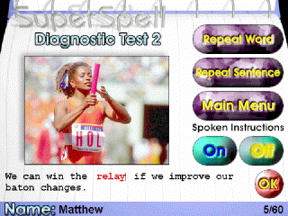 The aim of this test is not to diagnose specific spelling skills but to determine the most appropriate diagnostic test for the user to attempt. If the user was to complete the Placement Test they would be presented with fifty words. Each word which is chosen randomly has five equivalent words - hence there is a database of two hundred and fifty words, sentences and photographs. There are facilities for the user to repeat the spoken word or sentence before they type in the word.